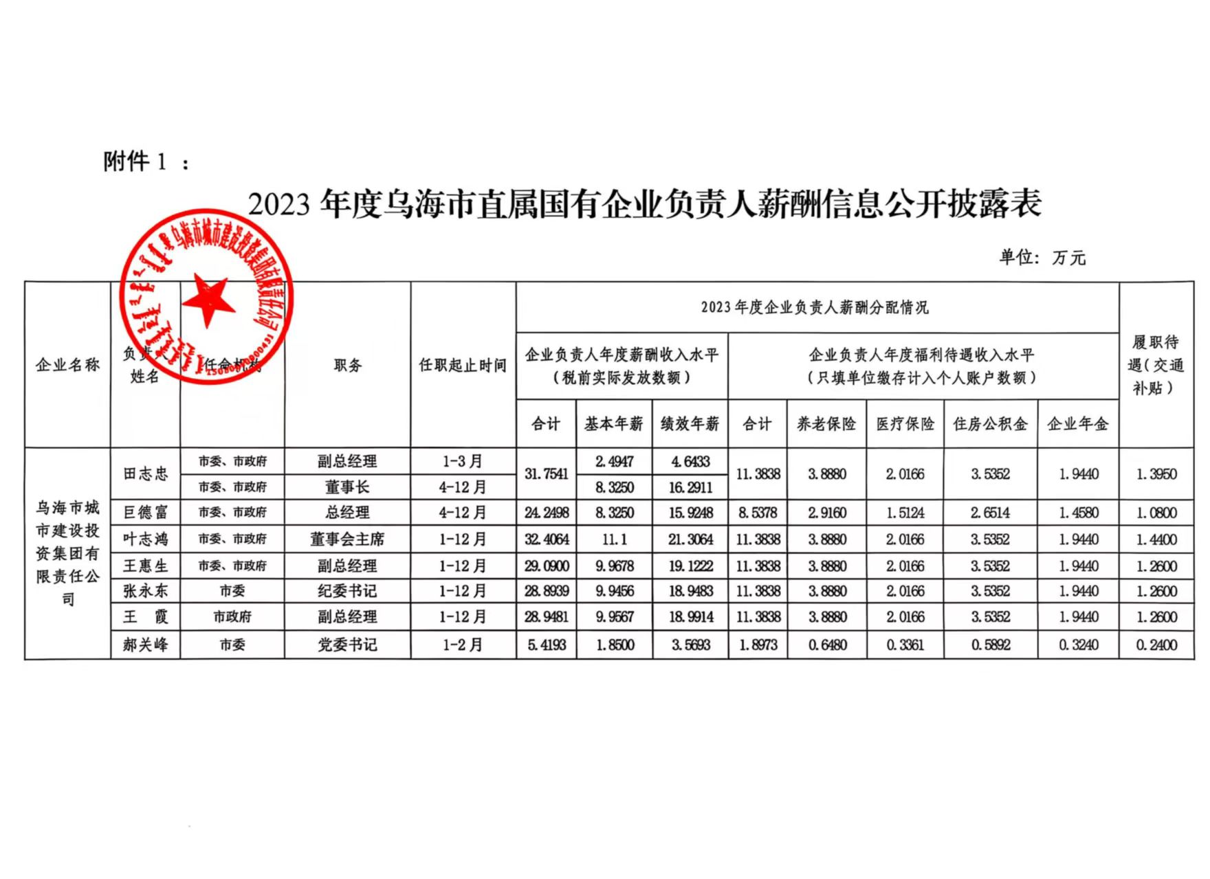 2023年度烏海市直屬國(guó)有企業(yè)負(fù)責(zé)人薪酬信息公開(kāi)披露表