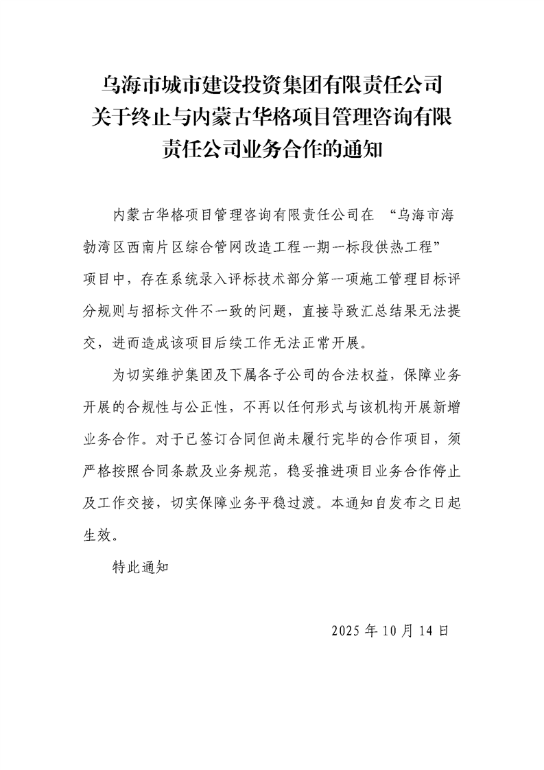 烏海市城市建設(shè)投資集團(tuán)有限責(zé)任公司關(guān)于終止與內(nèi)蒙古華格項(xiàng)目管理咨詢(xún)有限責(zé)任公司業(yè)務(wù)合作的通知